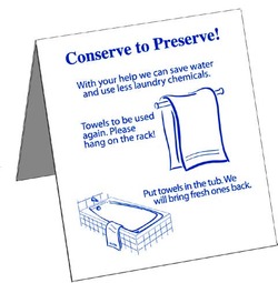 They are proudly displayed at most hotels and motels. Tugging on environmental strings that are pulled so tight these days you could play a tune. Some of the finer establishments go a step further and ask that you place a card on the bed directing the maid to leave the bed sheets right where they are, maybe straighten them up a bit. I typically go for this option, don’t see the need to change the sheets every day… I’m reasonably clean.